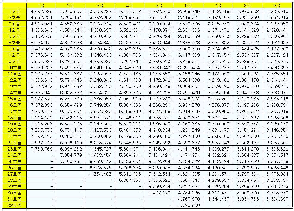 1급~9급까지 일률적으로 3% 인상된 봉급표입니다. 연말에 급수에 따라 인상률이 달라질 수 있으니 이 봉급표는 확정적인 것은 아닙니다만 6급~9급은 거의 변화가 없을 것입니다.